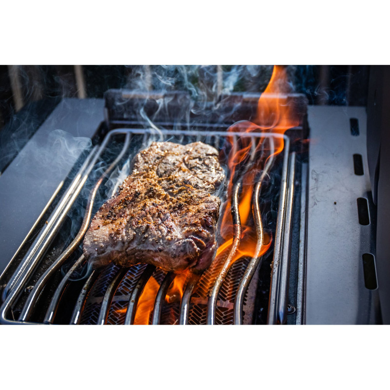 Инфракрасная боковая горелка SIZZLE ZONE. От 0 до 800 °C всего за 30 секунд! На большой инфракрасной горелке SIZZLE ZONE от Napoleon вы можете придать своим стейкам и бургерам отличную корочку и аппетитный запеченный аромат всего за несколько секунд. Незаменимая функция для всех любителей мяса: плавно регулируемая боковая горелка идеально подходит для приготовления хрустящих блюд в глазу, а также гарниров и соусов. Зона SIZZLE в гриле Prestige 500 Connected оснащена регулируемой по высоте решеткой из нержавеющей стали, что позволяет готовить при любой температуре.