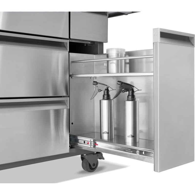 С интегрированными крючками для кухонных принадлежностей. Колесики с порошковым покрытием обеспечивают легкое перемещение на открытом воздухе. В качестве опции доступны регулируемые ножки для дополнительной стойкости.