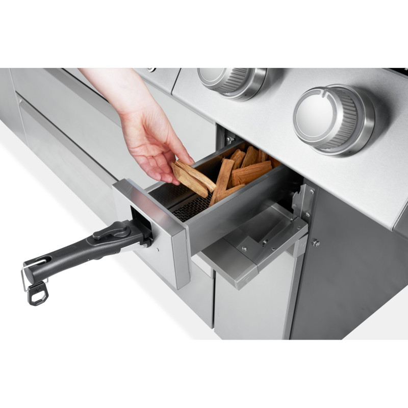 Гибридная топливная система с электрической коптильней. Настоящей изюминкой является встроенная электрическая коптильня. Треску или куски древесины можно добавлять, не открывая крышку. К 45 минутам непрерывного копчения позволяют получить интенсивный аромат с полным контролем температуры. Это сочетает в себе удобство газового гриля с подлинным вкусом древесного дыма – гибко и легко.