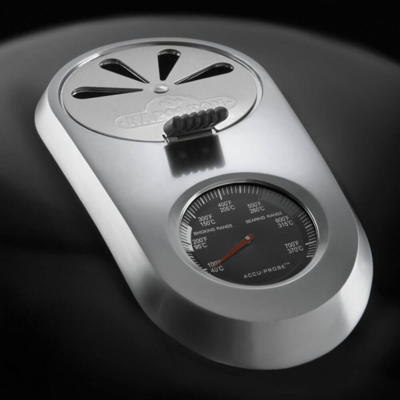 Крышка угольного гриля Napoleon NK22CK-C не съёмная, как у многих других грилей. Она закреплена на надежном механизме, который позволяет открыть её как капот у машины и зафиксировать. Перед Вами вся рабочая поверхность. Крышка герметично закрывается и способствует правильной циркуляции жара внутри гриля, что превращает его в конвекционную печь. Поток воздуха, который повышает или понижает температуру внутри, регулируется заслонками на крышке и в нижней части гриля. Температуру Вы всегда можете контролировать с помощью встроенного в крышку термометра ACCU-PROBE™.