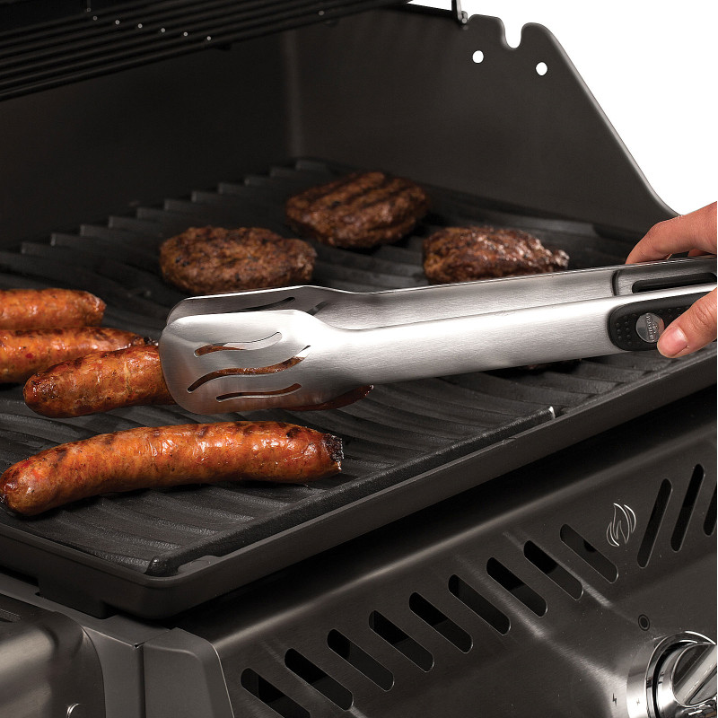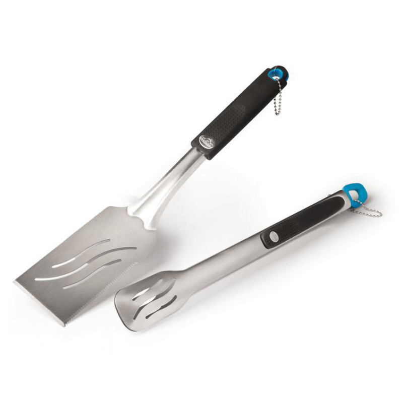 Опис Набір складається з двох найважливіших аксесуарів для гриля: лопатки та щипців для перевертання продуктів. Прилади підходять як для дрібних, так і для більших продуктів. Лопатка оснащена зубчастим краєм та лезом, тому з її допомогою можна легко подрібнити овочі та приготувати овочеву сковорідку або просто нарізати страви з гриля. Також лопатка ідеально підходить для гамбургерів та смаженого сиру. За допомогою щипців легко перевертати стейки та будь-які середні за величиною продукти. Щипці оснащені замком-фіксатором, який добре тримає прилад у закритому стані. Обидва прилади для барбекю виготовлені з нержавіючої сталі, ручки оснащені м'якою накладкою та кільцем для підвішування.