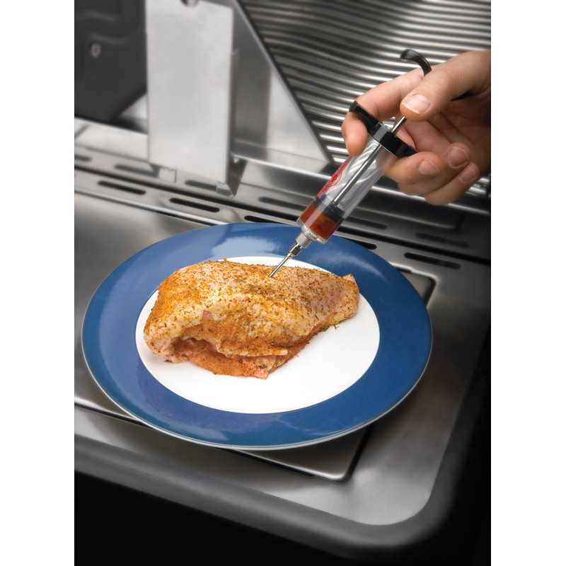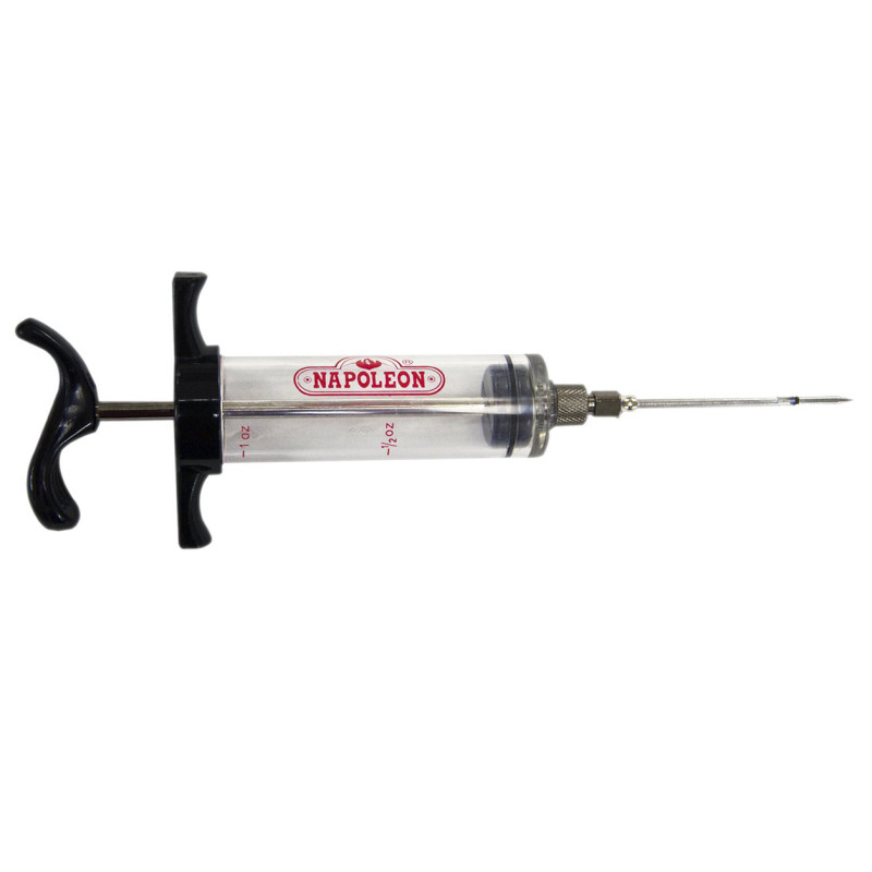 Опис Відмінний аксесуар для всіх грилерів. Просто додайте соус у ваш шприц для маринаду Наполеон і введіть його у великі шматки м'яса. Тим самим зробіть соковитішим будь-яке м'ясо, овочі і навіть картопля. Повторюйте, доки бажаний рівень вологи не буде досягнутий.