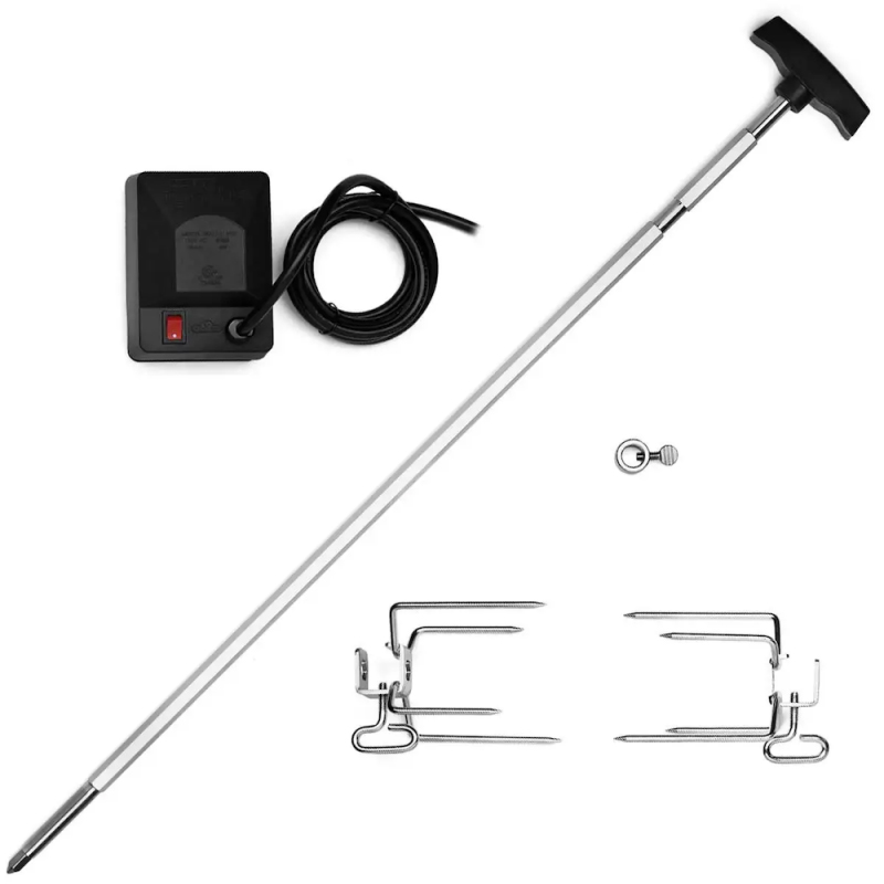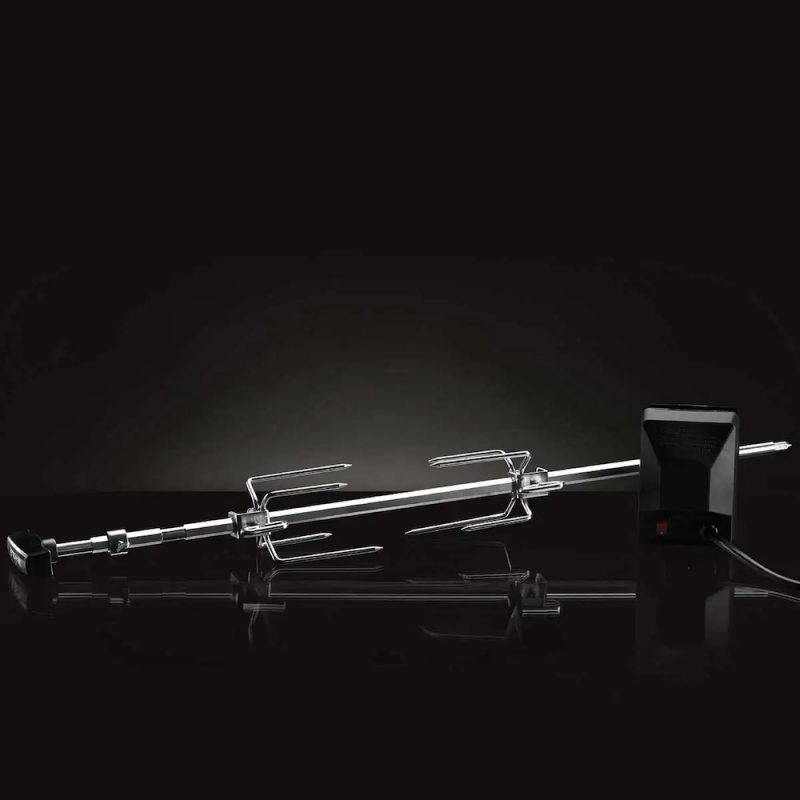 Рулети для жаркого, гірос або кілька смажених курчат: рожен вміщує до 6,8 кг продуктів, приготовлених на грилі, і обертається надійно та рівномірно. Постійне обертання надає стравам, приготованим на рожні, чудову скоринку та максимальний аромат смаженого м'яса. Міцні вилки для м'яса з чотирма зубцями надійно утримують продукти за допомогою гвинтів, а противагу забезпечує рівномірне обертання.