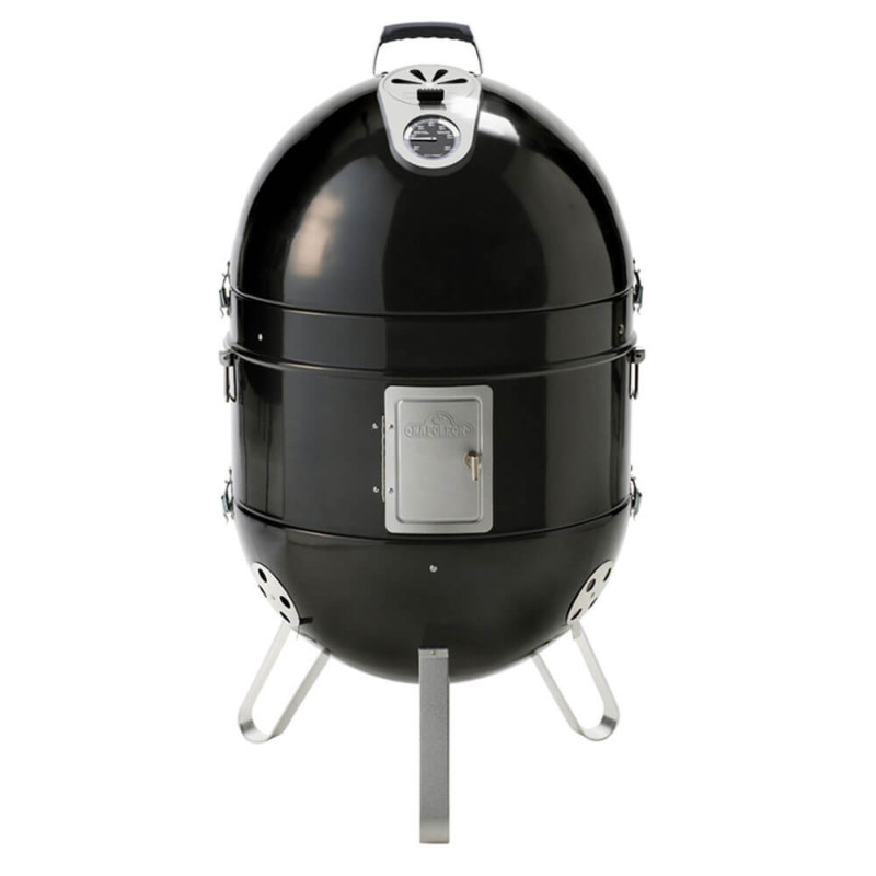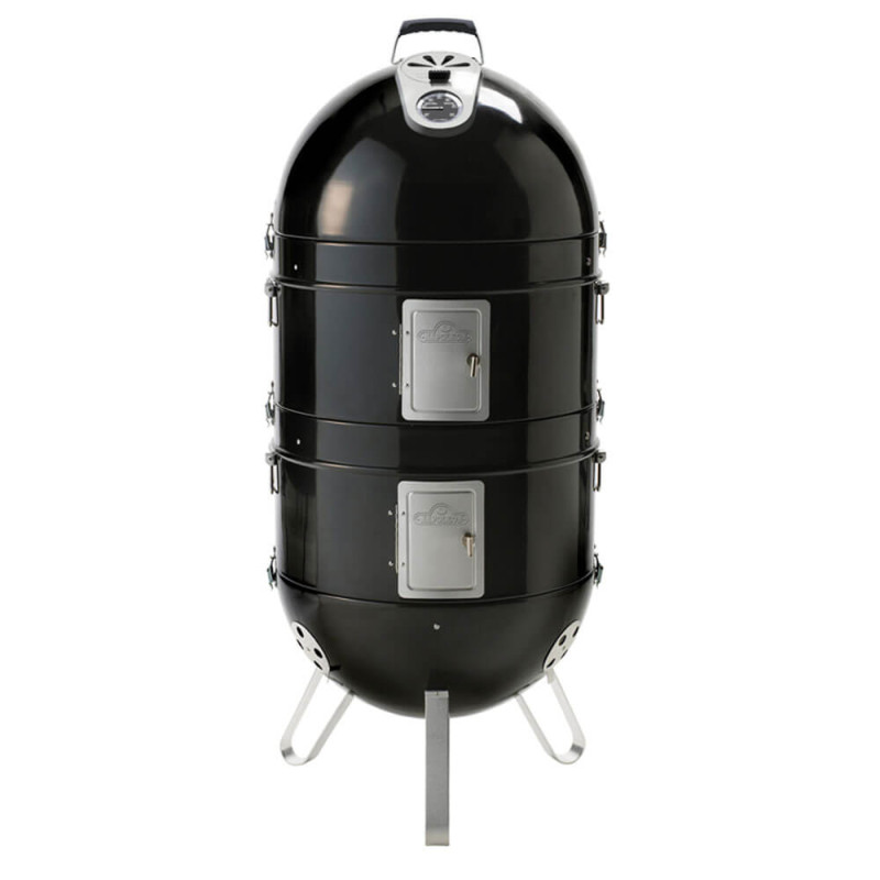 - Плотно прилегающие дверцы на петлях, обеспечивающие легкий доступ к емкости с водой и поддону с древесным углем.