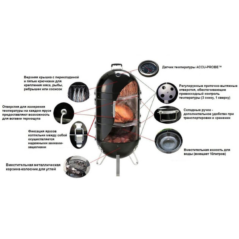 - Перекладина внутри крышки с пятью крючками для крепления мяса, рыбы, ребрышек или сосисок.