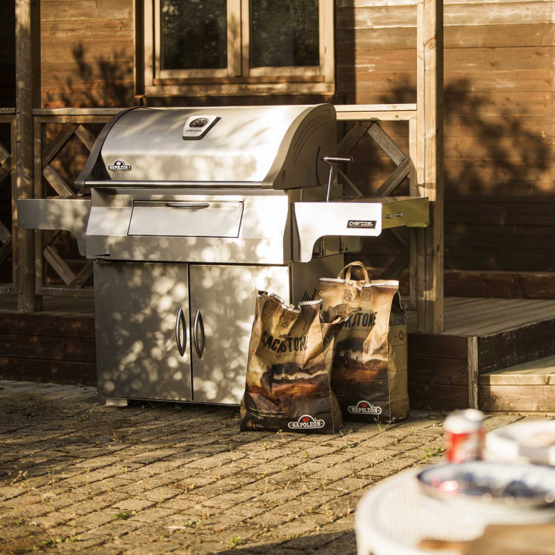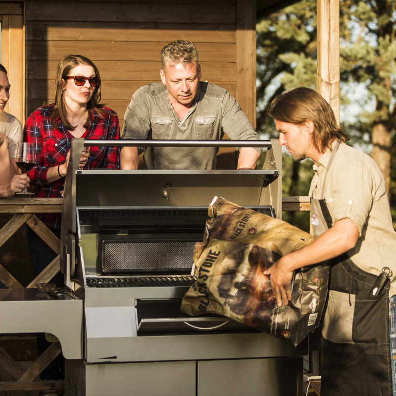 - Фронтальная дверца для загрузки угля и быстрого доступа к поддону с углем.